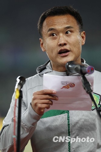 2010年3月27日,2010赛季中超联赛在北京工人体育场开幕,在东道主北京国安与南昌八一队开球之前,赛事主办方特意组织了一场开幕式,3万多名球迷入场观看比赛。图为徐云龙作为运动员代表进行宣誓。中新社发 盛佳鹏 摄