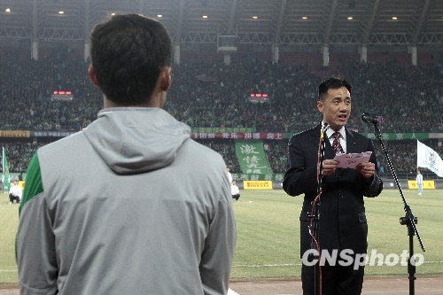 2010年3月27日,2010赛季中超联赛在北京工人体育场开幕,在东道主北京国安与南昌八一队开球之前,赛事主办方特意组织了一场开幕式,3万多名球迷入场观看比赛。谭海作为裁判员代表进行宣誓。中新社发 盛佳鹏 摄