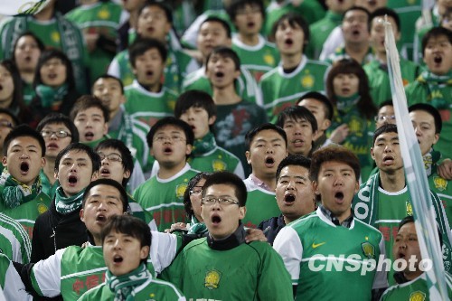 2010年3日27日,2010赛季中国足球超级联赛揭幕战在北京工人体育场打响。卫冕冠军北京国安队在主场迎战本赛季的升班马南昌八一队,3万多名观众入场观看比赛。图为北京国安队球迷为球队加油。中新社发 盛佳鹏 摄