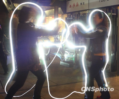近日,由网友发起的光涂鸦活动在北京朝外SOHO风筝大街上演,30余名网友用光涂鸦的形式表达对环保的诉求。无法储存的光通过光涂鸦利用单反相机延长曝光时间这种形式被保存了下来,光涂鸦将美丽的瞬间保留。整个活动历时一小时,网友们在这一小时内创造了数百幅作品。中新社发 夏奇才 摄