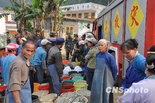 图为南宁消防支队官兵为百色旱区民众送水。中新社发 胡明军 摄