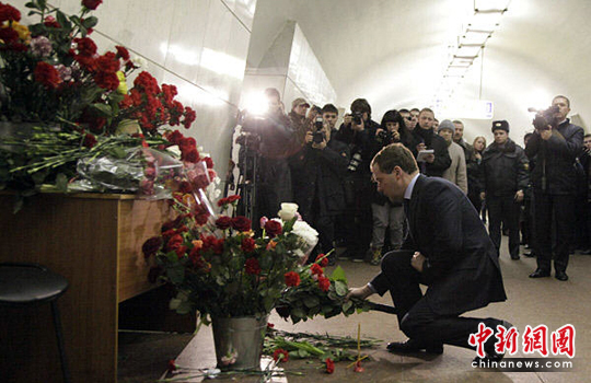 莫斯科时间29日上午,位于莫斯科市中心的卢比扬卡地铁站和文化公园地铁站接连发生爆炸。当日,俄罗斯总统梅德韦杰夫献上鲜花,向在恐怖袭击事件中的遇难者表示哀悼。