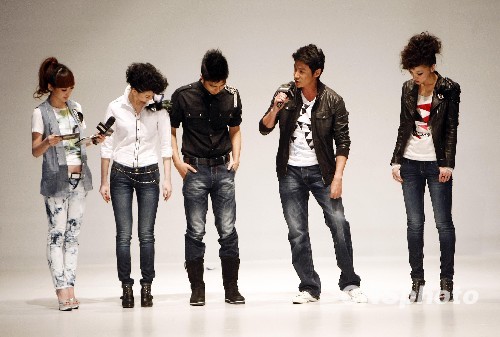 3月29日晚,影星陆毅(右二)、国际名模春晓(右)、“男才女貌”组合袁成杰(右三)、戚薇(左二)出席在北京举行的牛仔品牌JASONWOOD十周年庆典活动。