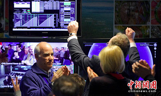欧洲核子研究中心的科学家在瑞士日内瓦附近的试验控制中心庆祝。