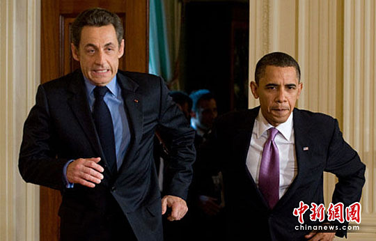 3月30日,在美国首都华盛顿白宫,美国总统奥巴马与到访的法国总统萨科齐在会谈后跑步出席记者会。