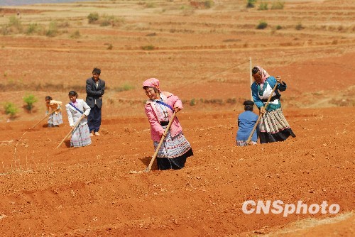 图为3月31日,昆明近郊禄劝县束刻村苗族农民抓住阵雨过后有利时机到烟田整地理墒抢种烤烟。中新社发 刘冉阳 摄