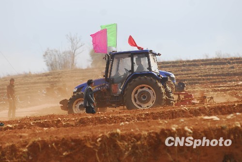 图为3月31日,昆明近郊禄劝县束刻村苗族农民抓住阵雨过后有利时机到烟田整地理墒抢种烤烟。中新社发 刘冉阳 摄