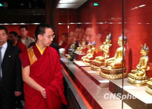 图为班禅在参观佛像展柜。中新社发 路梅 摄