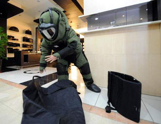 4月2日,北京市公安局举行防爆演练,检验大中型商场和北京市公安局各警种防恐防暴快速反应实战能力。