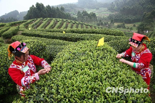 图为来自马边县的彝族姑娘正在忙碌地采茶。中新社发 张浪 摄