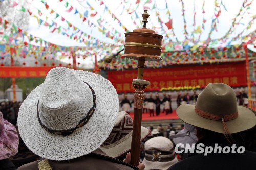 图为观众一边转经,一边看演出。中新社发 徐长安 摄