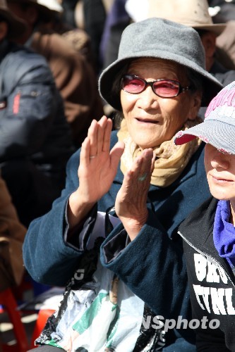 图为坐在观众席第一排的藏族老阿妈阿雍,伴随着演员的歌声和舞步,打着节拍轻声哼唱。中新社发 徐长安 摄