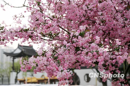 垂丝海棠争艳南京莫愁湖。中新社发 钟山 摄