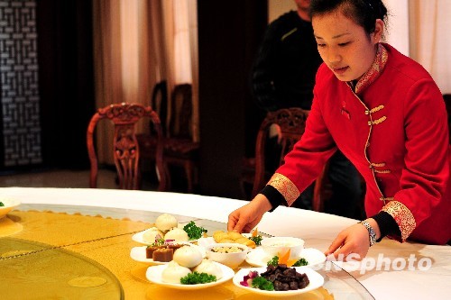 图为服务员摆放得月楼“世博小吃”。中新社发 李克祥 摄