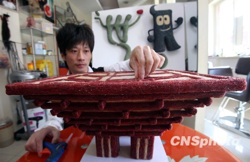 美发师对用头发丝制成的上海世博会“中国馆”作品作最后的修整。中新社发 陈晓根 摄
