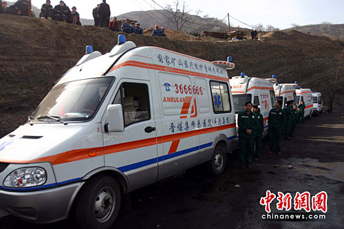 4月3日上午,华晋焦煤公司王家岭矿透水事故第七天,在得到井下有强烈生命反应的抢险人员士气上得到了极大鼓舞,正在继续加大力度排水,现已排水已达到每小时1935立方米,水位线下降5.3米,紧急救护车已到现场24小时待命,随时准备急救从井下获救的矿工。