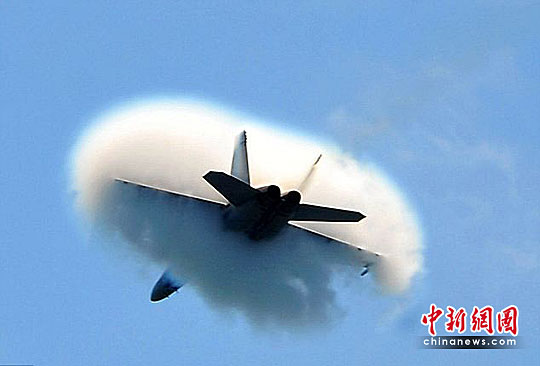除此之外,由于在物体的速度快要接近音速时,周边的空气受到声波叠合而呈现非常高压的状态,因此一旦物体穿越音障后,周围压力将会陡降。在比较潮湿的天气,有时陡降的压力所造成的瞬间低温可能会让气温低于它的露点(Dew Point)温度,使得水汽凝结变成微小的水珠,肉眼看来就像是云雾般的状态。但由于这个低压带会随着空气离机身的距离增加而恢复到常压,因此整体看来形状像是一个以物体为中心轴、向四周均匀扩散的圆锥状云团。