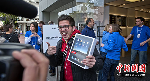 图为一位刚刚买到ipad的消费者兴奋的走出加州苹果零售店。中新社发 陈钢 摄
