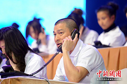 图为刘德华亲当接线员,接听捐款电话。中新社发 李学仕 摄