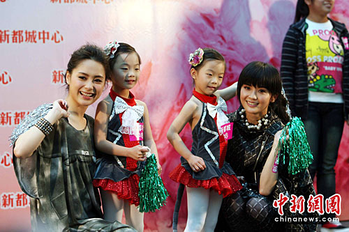 图为蔡卓妍(右)、钟欣桐与演绎Twins歌舞的一对小孪生姐妹开心合影。中新社发 洪少葵 摄