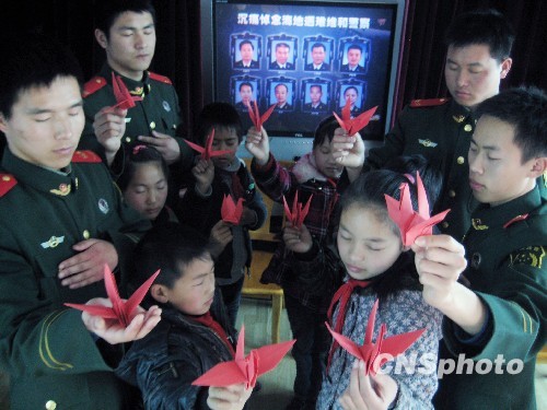 边防官兵与学生手持千纸鹤默默许愿,深切缅怀革命英烈。中新社发 李进雄 摄