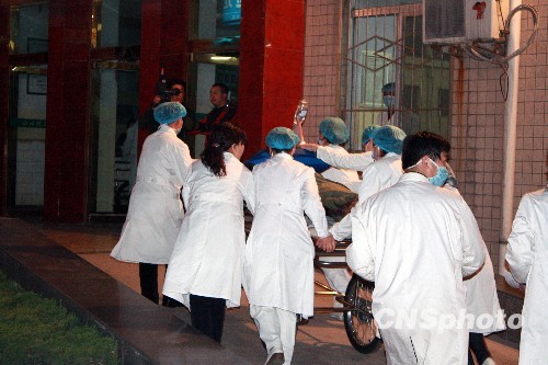 首名王家岭煤矿被困矿工由晋煤集团总医院急救车送至山西铝厂职工医院救治。中新社发 王卫平 摄