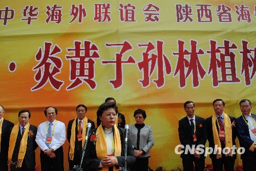 图为4月5日,港澳台和海外侨胞参加“炎黄子孙林”植树活动,全国人大常委、前香港立法会主席范徐丽泰在致辞。中新社发 冽玮 摄
