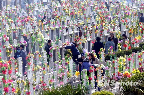 扫墓者用花束将墓地装点成了“花海”。中新社发 叶首卫 摄