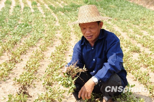 海南琼海,龙江镇蒙养村民种植在滩涂上的花生大量枯死,一位村民正在查看旱情。 中新社发 蒙钟德 摄