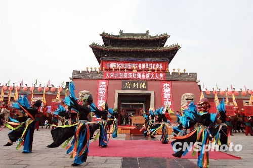 4月5日,在河南开封府全衙仪仗队和大宋官兵的簇拥下,开封府府尹“包拯”正在“钻木取火”,随后向北宋“各国使节”、“各藩国大使”和“普通民众”颁新火,北宋九帝依次排开也在城楼观看。据开封府景区负责人介绍,唐宋时,清明前一日禁火寒食,到清明节再起火,称为“新火”,所以当时每年都要举行“颁新火”仪式。仪式之前用榆木钻火,先得火者,朝廷赏绢三匹、金碗一口。