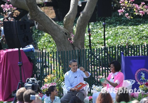 美国白宫5日举办传统的年度复活节“滚蛋”活动,美国总统奥巴马与夫人米歇尔在白宫南草坪为前来参加活动的儿童讲故事。中新社发 李静 摄
