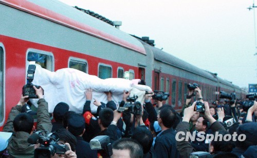 6日6时16分,“3•28”透水事故获救重症工人被公安民警抬上去太原诊治的专列。中新社发 王卫平 摄