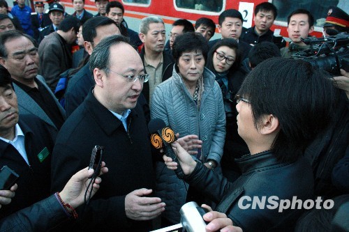 6日6时20分,卫生部负责人在河津火车站站台接受记者采访。当日,山西“3•28”透水事故获救的60名重症工人通过专列转运省城太原救治。中新社发 王卫平 摄