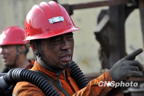 4月6日,一名救援矿工负责人在下井时给工友作指导。山西王家岭煤矿透水事故进入第10天,山西潞安集团矿山救护队一位负责人认为,今天已进入救援的关键之日。目前,井下仍有38名被困者。
