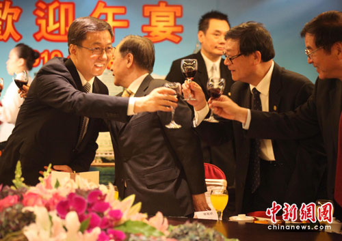 4月6日,刚刚抵达台湾的上海市长韩正在下榻的台北晶华酒店,出席上海台协会、台北浦东同乡会、崇明同乡会的联合宴请,在台北与台商、乡亲见面,乡音乡情浓。中新社发 罗钦文 摄