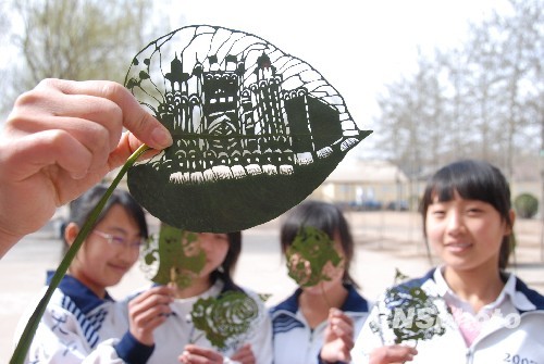 4月6日上午世博会临近,山东潍坊剪纸爱好者范云用白杨、龟背竹等植物叶为原料,经过近10道工序,历时百余天精心剪出了形态各异的世博会吉祥物“海宝”和各个场馆,表达她对世博会的祝福。中新社发 孙树宝 摄
