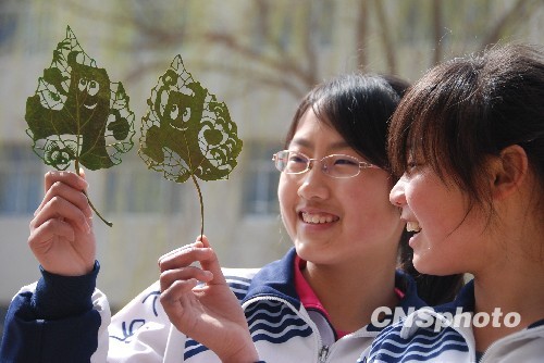4月6日上午世博会临近,山东潍坊剪纸爱好者范云用白杨、龟背竹等植物叶为原料,经过近10道工序,历时百余天精心剪出了形态各异的世博会吉祥物“海宝”和各个场馆,表达她对世博会的祝福。中新社发 孙树宝 摄