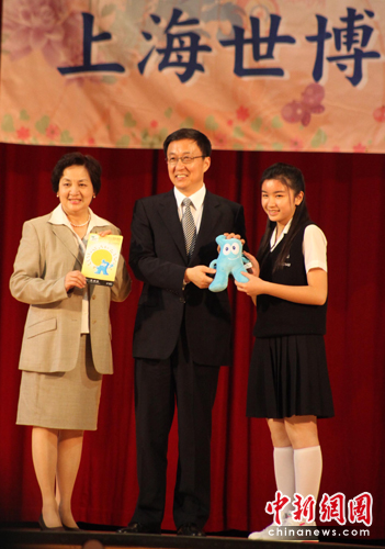 4月6日下午,上海市长韩正在台北市立中山女子高级中学向台湾十三所中学的校长和学生代表赠送了上海世博会门票与吉祥物。