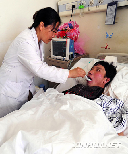护士正在为脱困工人崔进存喂食。范敏达摄