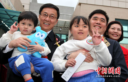 4月7日下午,上海市长韩正在台北参观完北投焚化场后,与凯撒琳托儿所的小朋友亲切互动。图为韩正(左)向小朋友赠送上海世博会吉祥物“海宝”,并笑着抱起一名小男孩,台北市长郝龙斌则赠送小朋友“花博会”环保铅笔。中新社发 董会峰 摄