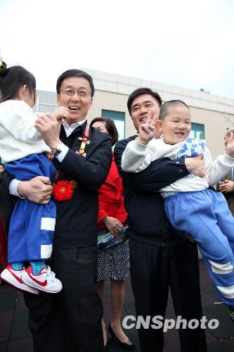 4月7日下午,上海市长韩正与台北私立凯撒琳托儿所的小朋友亲切互动。图为韩正与台北市长郝龙斌各抱起一名小朋友,笑声朗朗。中新社发 董会峰 摄