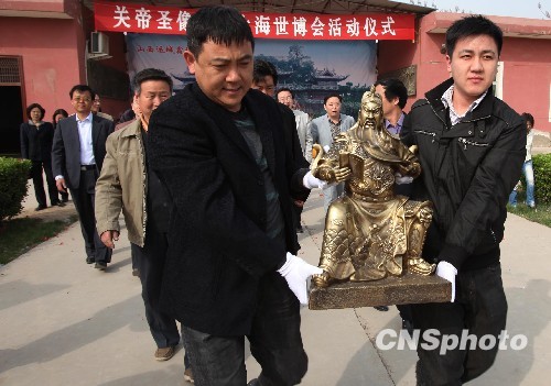 两名工作人员护送即将起驾上海世博会山西展区的关帝圣像《夜观春秋》。中新社发 卫行智 摄