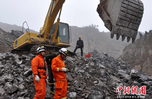4月8日,四川峨眉山市乐都镇顺江采石场救援现场一片忙碌,消防官兵连续两次携带最先进的生命探测仪对山体垮塌区域进行生命探测,但遗憾的是,没有探测到垮塌的山体下有任何生命迹象。图为消防官兵正在现场探测生命迹象。中新社发 刘忠俊 摄