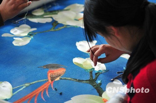 4月8日,由苏州刺绣研究所30多位绣娘精心绣制的三幅苏绣作品,通过了上海世博局官员和专家的正式验收,将作为中国刺绣的唯一代表陈列在上海世博会国家馆贵宾厅。三幅苏绣作品均为宽3米、高1.4米的大型双面绣地屏,题材分别为《玉兰绶带》、《玉兰黄鹂》、《玉兰和平鸽》。30多位绣娘分成三班,24小时日夜不停绣制了65天,终于在今天全部完成。中新社发 李克祥 摄
