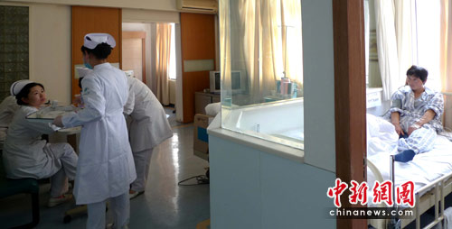 4月8日,山西华晋煤矿王家岭透水事故中,60名被解救的矿工转院至山西太原,山西省人民医院接治了20名工友。为了使二十几位工友早日康复,山西省人民医院抽调了150名专职医护工作者参加直接治疗,每位住院工友均配备有对口医生、专职特护、心理医生、营养师等。中新社发 黎平 摄