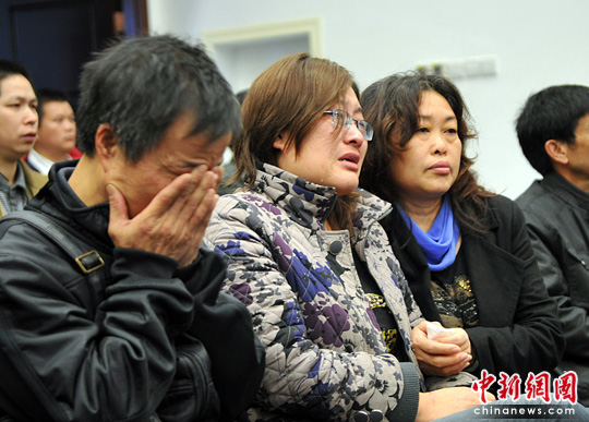 4月8日,南平中院开庭审理郑民生一案,当公诉人说到凶犯郑民生的行凶过程念到8名遇难孩子的名字时,第一法庭内哭声此起彼伏,侯妈妈(中)情绪多次受控,痛哭流涕,嘴里不停说到再过4天就是孩子10岁生日啊,在场警卫人员多次上前劝慰。死者侯传杰是南平实验小学四年级7班的学生,其父50多岁,其母也近50岁,真是白发送黑发人。中新社发 张丽君 摄