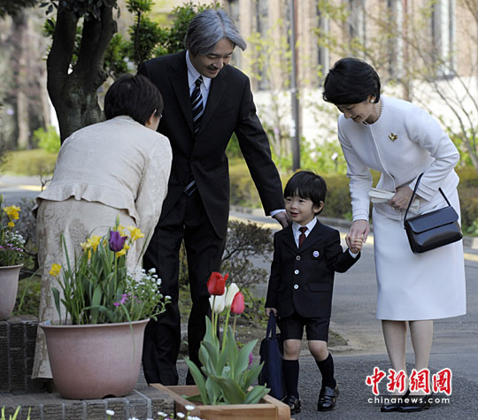 4月9日,3岁的日本皇太孙悠仁亲王在父母陪同下,来到位于日本东京的御茶水女子大学幼儿园参加入园仪式。