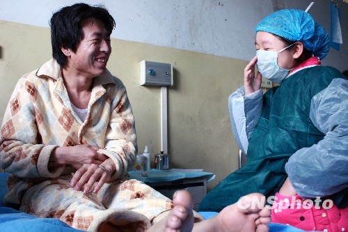 王家岭煤矿事故获救工人邢文杰在医院与妻子郭小娟开心交谈。中新社发 王卫平 摄