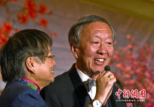 当地时间4月8日,2009年诺贝尔物理学奖得主高锟出席百人会第19届年会,接受该会颁发的“杰出成就奖”。图为高锟太太黄美芸陪同高锟领奖。中新社发 陈钢 摄