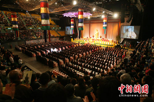 4月9日晚,由香港佛光道场、佛香堂、国际佛光会香港协会主办的“消灾祈福大悲忏法会”,在红磡香港体育馆举行。星云大师和60多位远度而来的佛光山法师带领6000多名大德居士共修大悲忏法会,场面详和感人。中新社发 郑祚声 摄